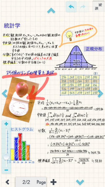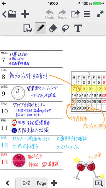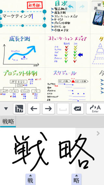 Note Anytimeは、紙とペンを使う感覚で、画面上に直感的にノートを書くことができます。線の色や太さ、メモの種類も選べるので、イメージに近い形で文書を作成できます。写真やイラスト、Webサイトの画像なども簡単に取り込めるだけでなく、写真の拡大・縮小、回転も簡単。ます。強調やデコレーションを行いたい場合には、ライブラリにあらかじめ用意されているアイコンやイラストを活用しましょう。修正も簡単で、Undoボタンを押すか、消しゴムアイコンを選んで消したい部分を選択するだけでOKです。